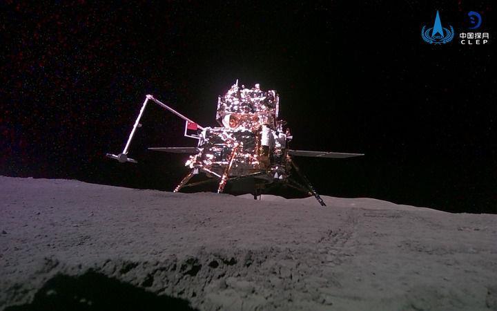△2024年6月3日,嫦娥六號(hào)攜帶的“移動(dòng)相機(jī)”自主移動(dòng)后拍攝并回傳的著陸器和上升器合影。
