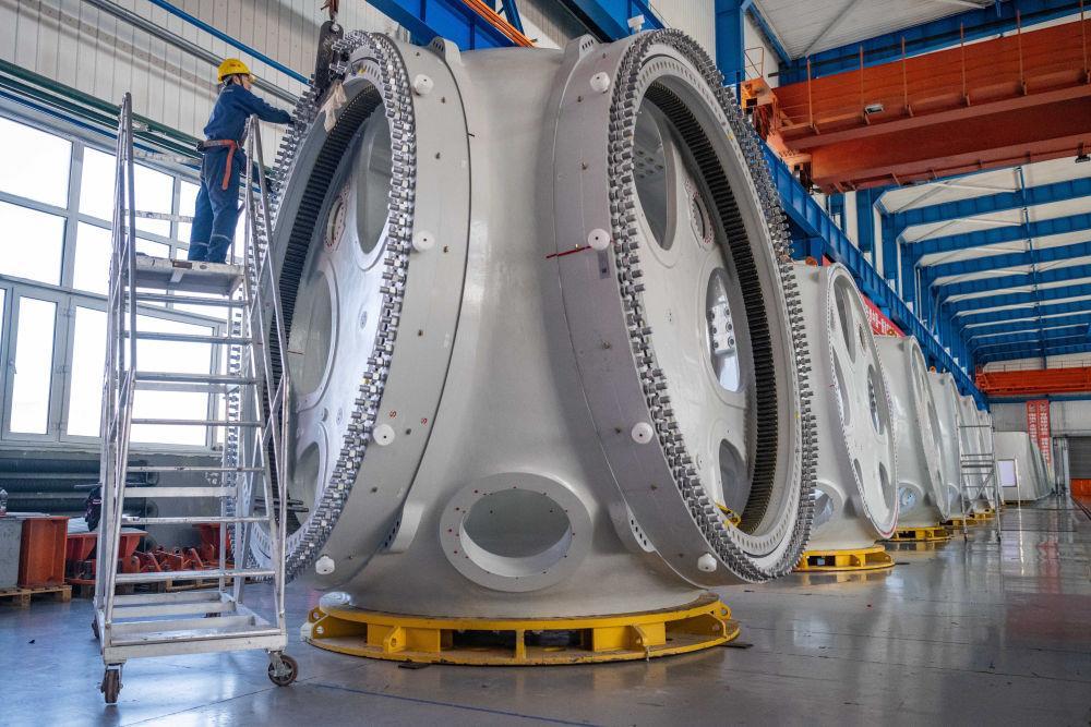 △2024年4月28日,工作人員在中國一重集團(tuán)有限公司的風(fēng)電設(shè)備裝配車間內(nèi)加工風(fēng)電輪轂。