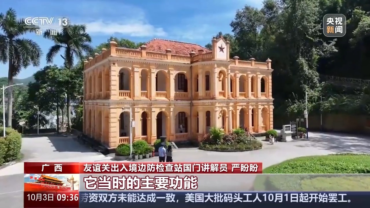 友誼關(guān)出入境邊防檢查站國門講解員 嚴(yán)盼盼:在友誼關(guān)城樓的正后方就是法式樓,法式樓建于1914年,由法國人設(shè)計、中國人建造。它當(dāng)時的主要功能是負(fù)責(zé)邊境的外交以及邊境的治安。前面就是越南友誼國際口岸,友誼關(guān)不光是景區(qū),紅色愛國主義教育基地,它還承擔(dān)著旅檢和貨檢的通關(guān)功能。友誼關(guān)將打造成智慧口岸,實現(xiàn)24小時的貨物通關(guān)。