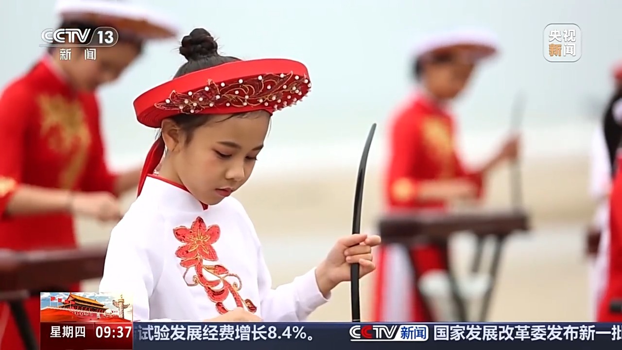 總臺央視記者 武兵:這片海灘叫金灘,這里與東興口岸只有28公里的距離,在這里也是我國唯一一個海洋民族京族的聚居地。京族可以說是既沿邊又沿海,這里與越南的萬柱旅游區(qū)可以說是一海之隔,從這里到越南的下龍灣也只有70海里。京族歷史悠久,體系完整,有自己的文字、語言和音樂。今天我們就先來看一下京族的非物質(zhì)文化遺產(chǎn)獨弦琴。
