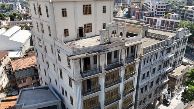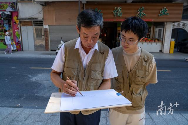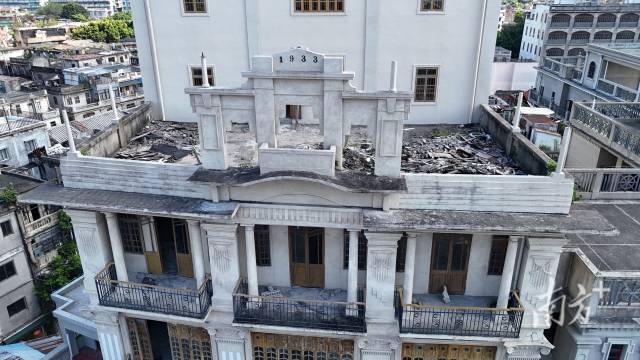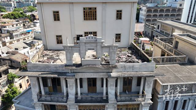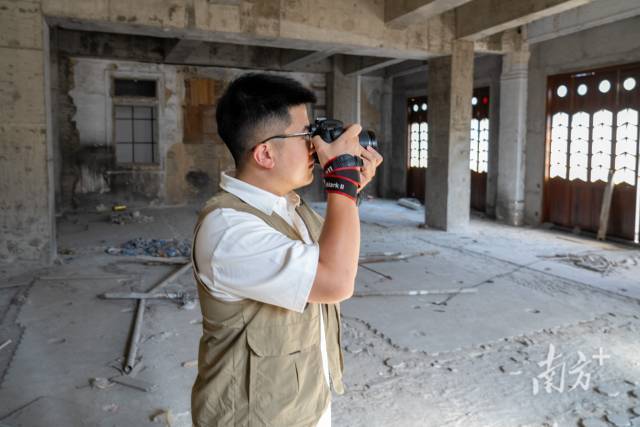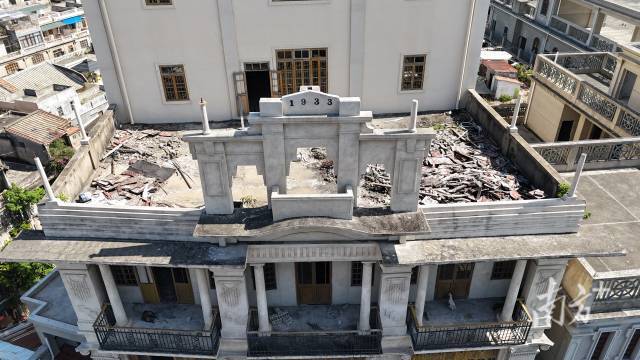 年輕的隊(duì)員們掏出了“新工具”——無(wú)人機(jī)。在航拍下,自稱(chēng)“文保新生”的盧孟羽發(fā)現(xiàn),汕頭大廈舊址頂樓的白色牌坊上,刻著代表出生年份的數(shù)字“1933”。這張全新角度的照片順利補(bǔ)充進(jìn)了檔案里。