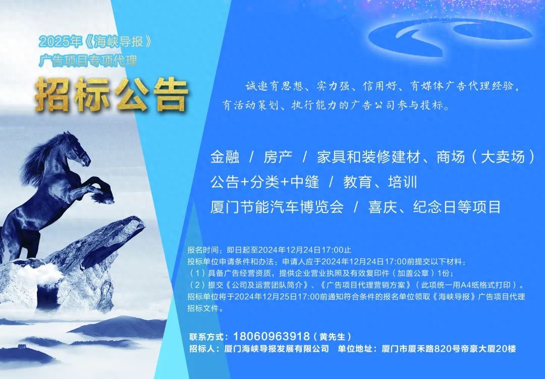 招標單位將于2024年12月25日17:00前通知符合條件的報名單位領(lǐng)取《海峽導(dǎo)報》廣告項目代理招標文件。