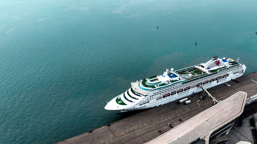 ↑一艘國際郵輪??吭谔旖驀H郵輪母港(無人機照片,12月19日攝)。