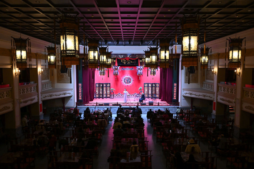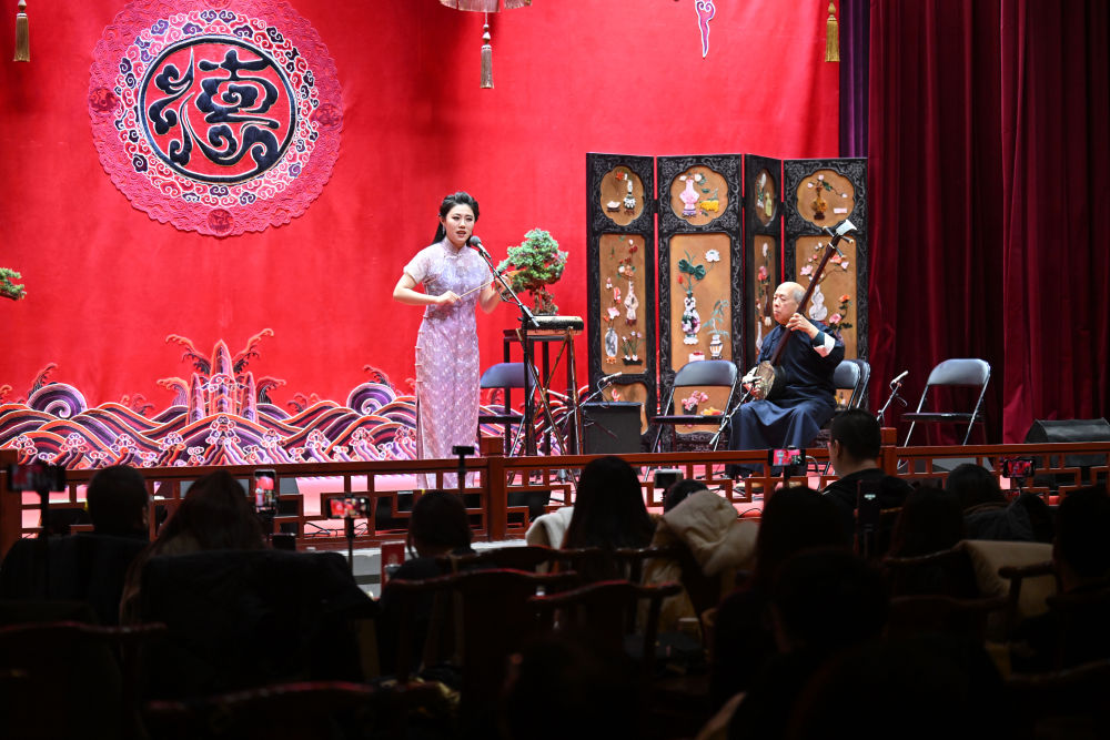 ↑市民在天津德云社觀看鼓曲演出(12月21日攝)。