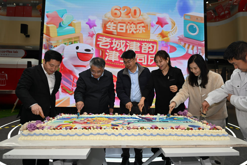 ↑市民及專家學者在位于天津南開區(qū)的一家商場內為城市慶生切蛋糕(12月22日攝)。