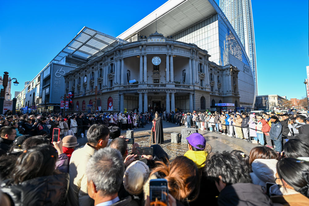 ↑市民游客在天津金街大銅錢廣場觀看天津人民藝術劇院帶來的沉浸式戲劇演出(12月21日攝)。
