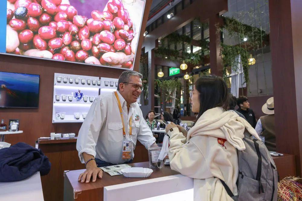 △2024年11月5日,第七屆進(jìn)博會(huì)國家展尼加拉瓜館的工作人員向觀眾介紹商品。