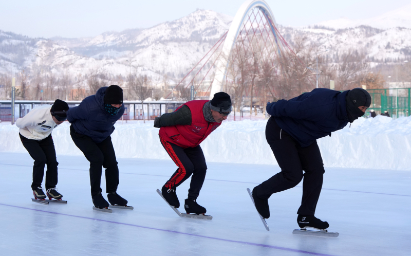 不一會兒,一群孩子涌入冰場,他們是阿勒泰市業(yè)余體校的小運(yùn)動員,年齡8到15歲不等。他們脫下厚重的棉衣,換上連身服,開始在冰面上滑行,在教練的指揮下,時而沖刺,時而慢行調(diào)整,輕快的腳步讓“老朋友們”贊嘆,“這些小孩厲害啊,比我們那會兒強(qiáng)多了”。
