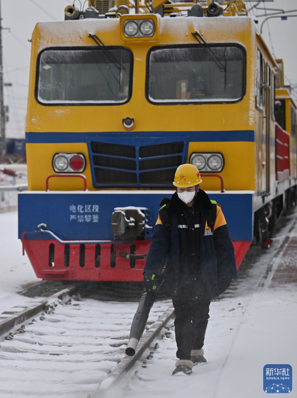 1月26日,在天津供電段接觸網(wǎng)綜合維修列基地,鐵路職工在清理積雪。