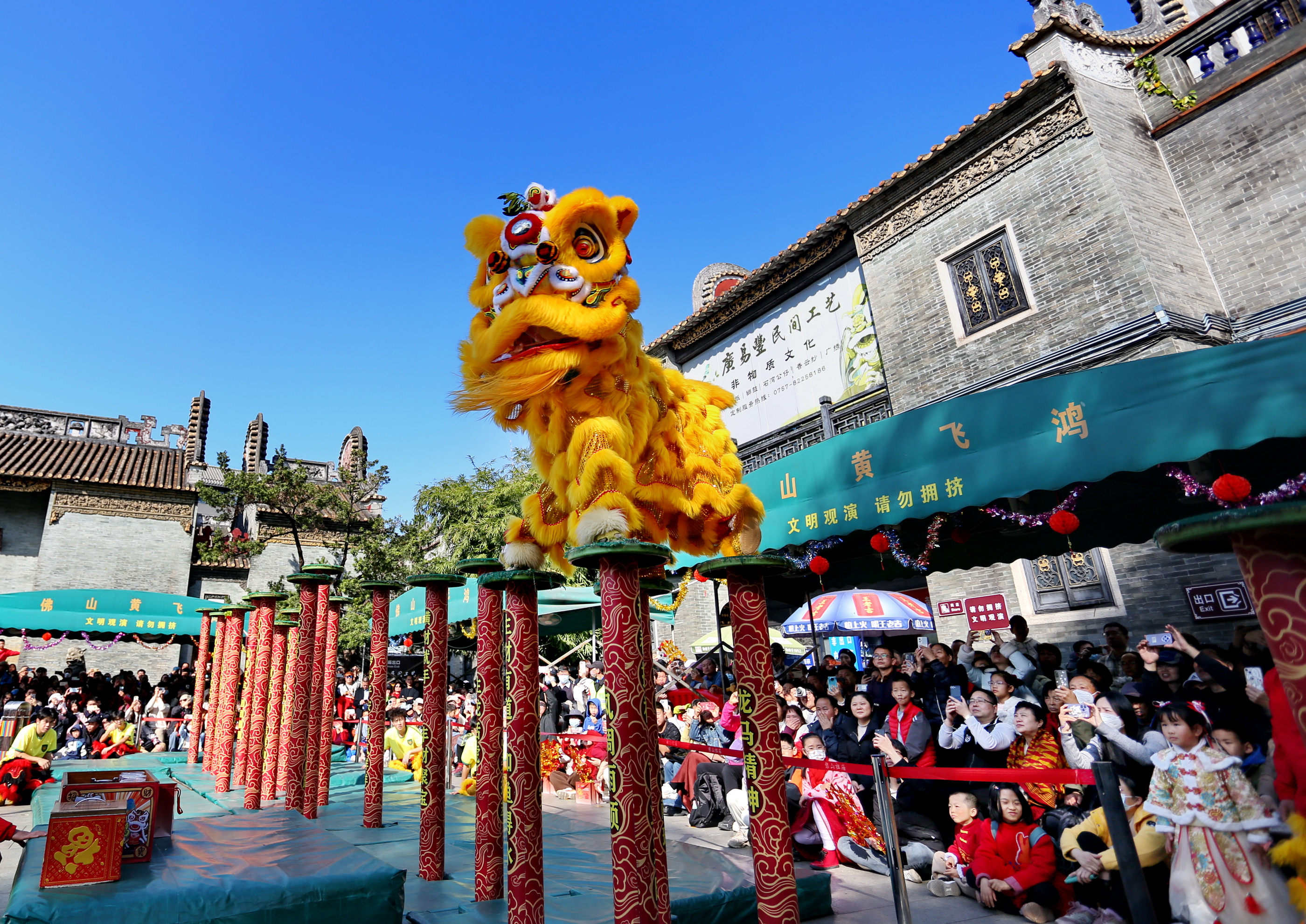 1月29日,佛山黃飛鴻獅隊(duì)在廣東省佛山市祖廟景區(qū)進(jìn)行梅花樁表演。