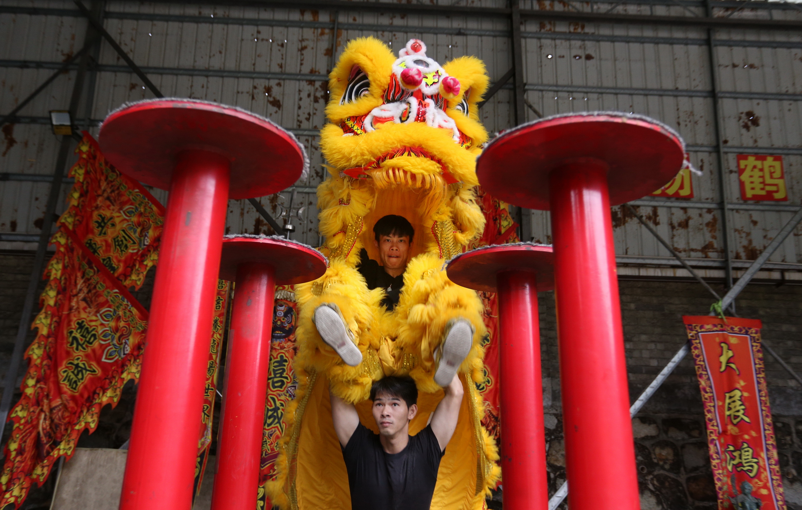 1月24日,在廣東省鶴山市鶴城鎮(zhèn),醒獅隊(duì)隊(duì)員進(jìn)行梅花樁舞獅訓(xùn)練。