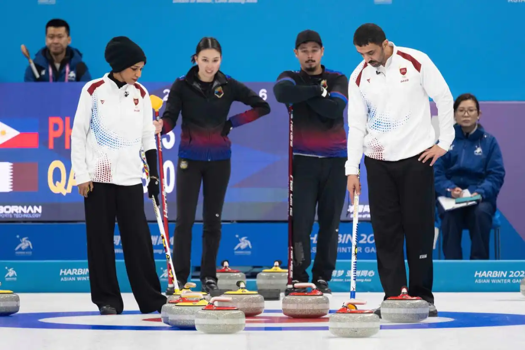 △2月5日,亞冬會(huì)冰壺混雙循環(huán)賽B組第3輪比賽中,菲律賓隊(duì)11比3戰(zhàn)勝卡塔爾隊(duì)。