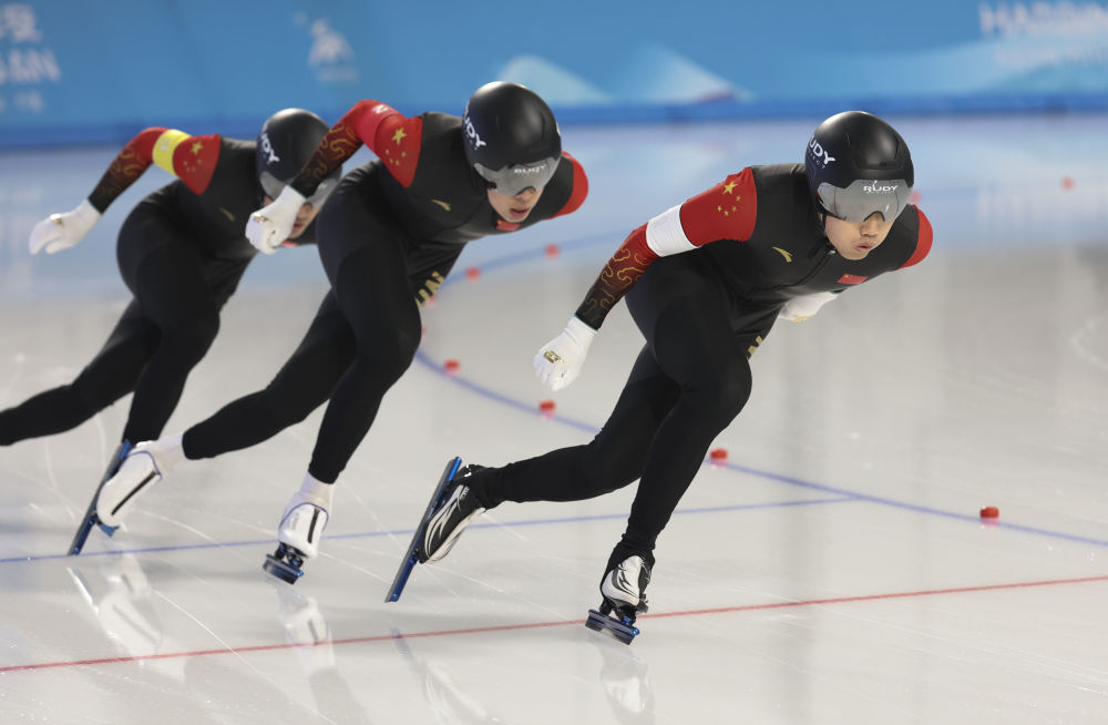 2月10日,中國隊(duì)選手高亭宇(右)、寧忠?guī)r、廉子文(中)在比賽中。當(dāng)日,第九屆亞冬會速度滑冰男子短距離團(tuán)體追逐賽在哈爾濱舉行。中國隊(duì)獲得冠軍。新華社記者 呂帥 攝