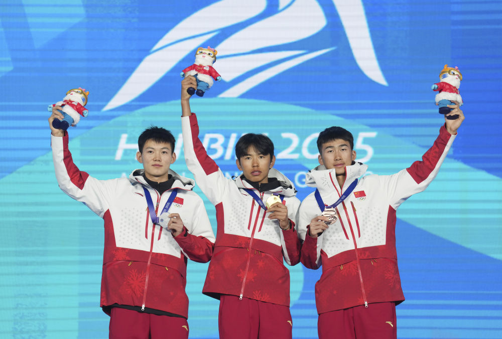 2月9日,布魯爾(中)、張成浩(左)和畢禹新在頒獎儀式上。當(dāng)日,在第九屆亞冬會滑雪登山男子短距離決賽中,中國選手布魯爾、張成浩和畢禹新包攬前三名。新華社記者 王松 攝