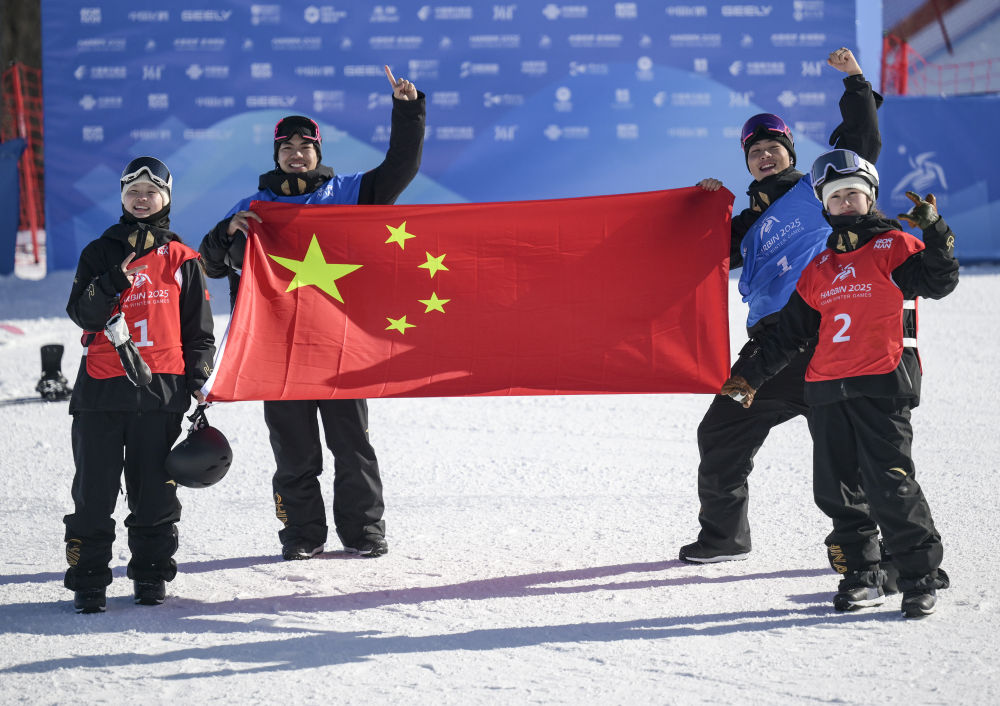 2月10日,中國選手張小楠、楊文龍、姜鑫杰與熊詩芮(從左至右)在比賽后慶祝。當(dāng)日,在亞布力舉行的第九屆亞冬會單板滑雪女子大跳臺決賽中,中國選手熊詩芮奪冠,張小楠獲得亞軍;在男子大跳臺決賽中,中國選手楊文龍奪冠,姜鑫杰獲得亞軍。新華社記者 牟宇 攝