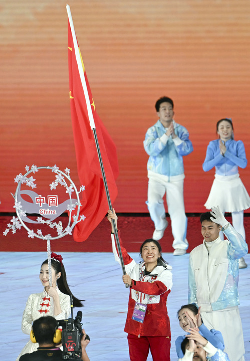 自由式滑雪運動員徐夢桃擔(dān)任中國代表團(tuán)的旗手。35歲的她,是中國雪上項目的傳奇人物,實現(xiàn)了冬奧會、世錦賽、世界杯等多項大賽的大滿貫,成為中國雪上項目首位實現(xiàn)“全滿貫”的運動員。在本屆亞冬會上,她以 90.94 分的成績奪得女子空中技巧金牌,還帶領(lǐng)團(tuán)隊在多個項目中斬獲佳績。她堅韌不拔的精神和卓越的競技表現(xiàn),正是中國冰雪運動員的代表。
