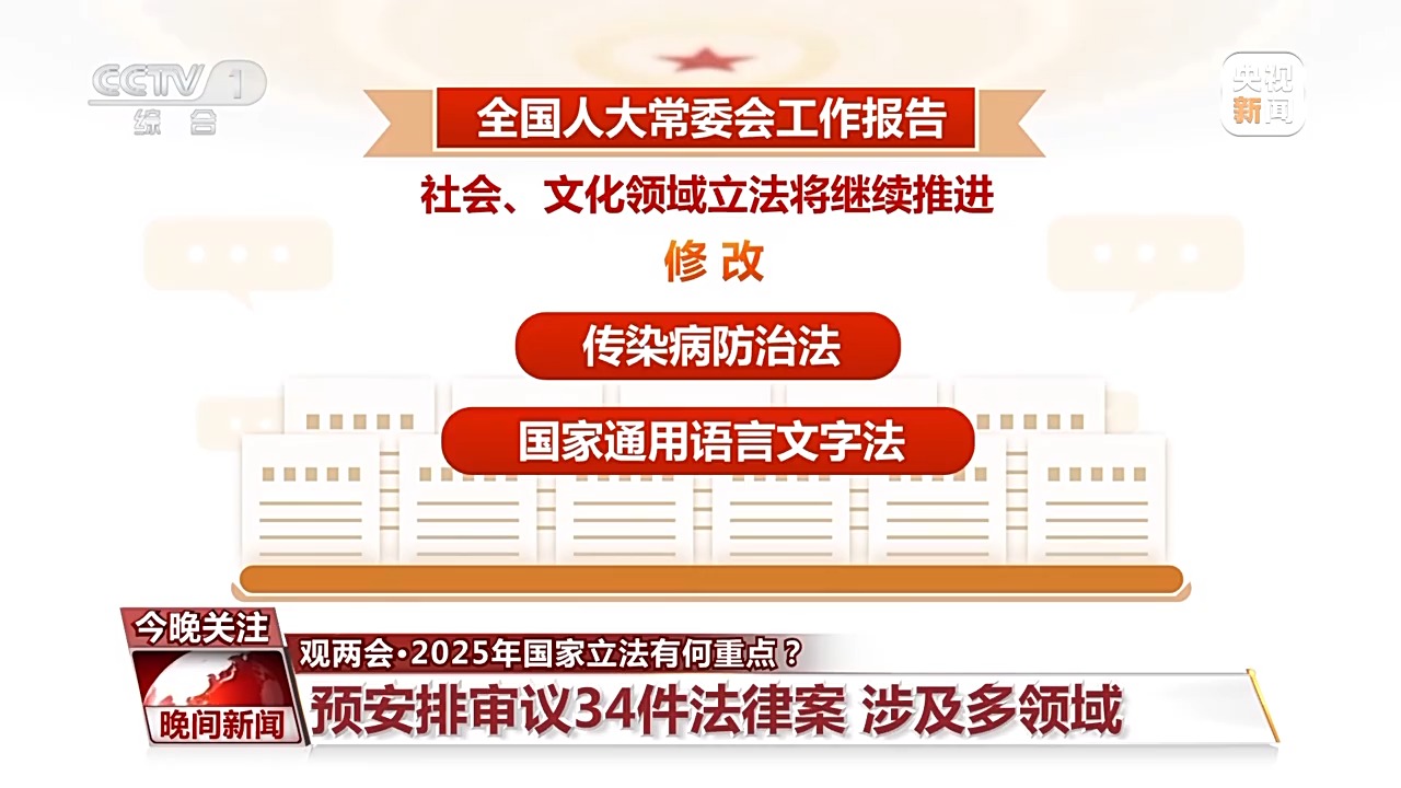 社會、文化領(lǐng)域立法將繼續(xù)推進,2025年將制定法治宣傳教育法、社會救助法、托育服務(wù)法檢察公益訴訟法,修改傳染病防治法和國家通用語言文字法。