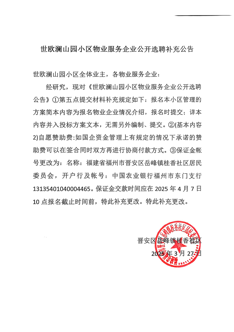 世歐瀾山園小區(qū)物業(yè)服務(wù)企業(yè)公開選聘補充公告
