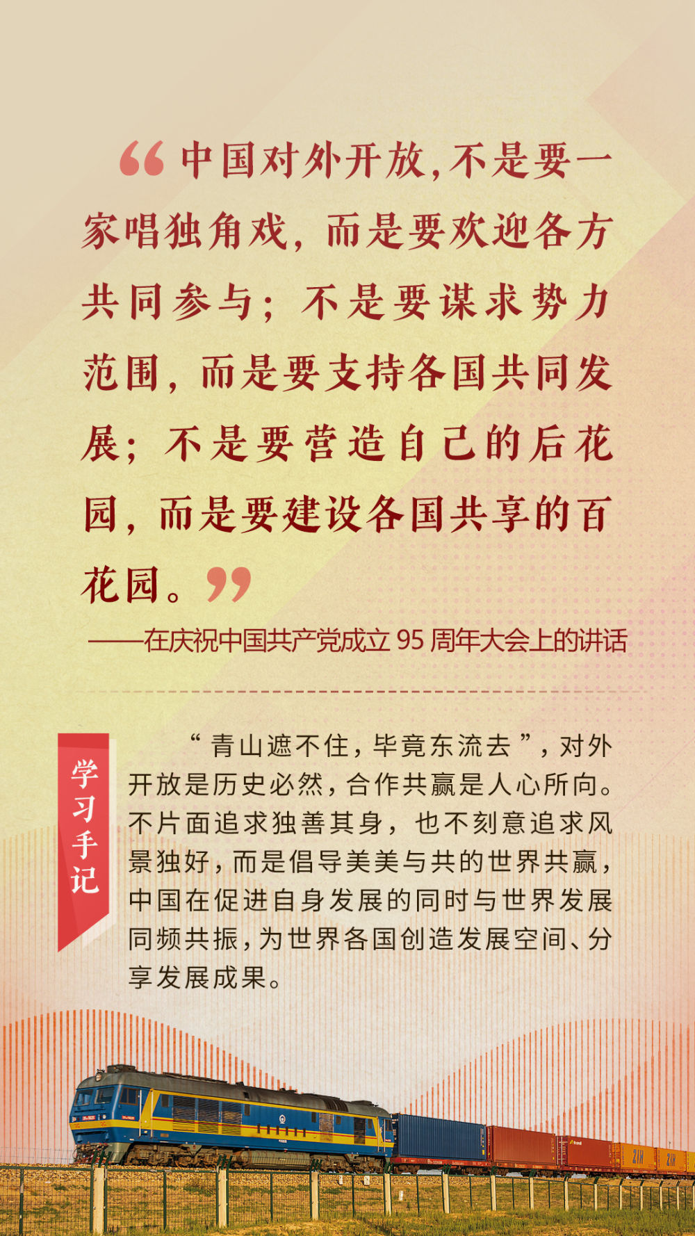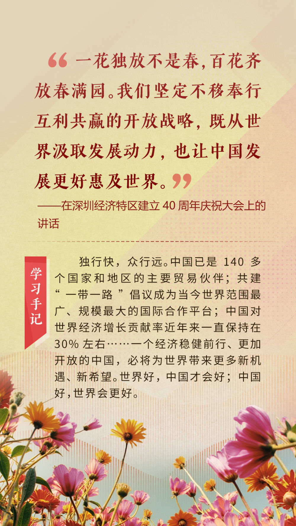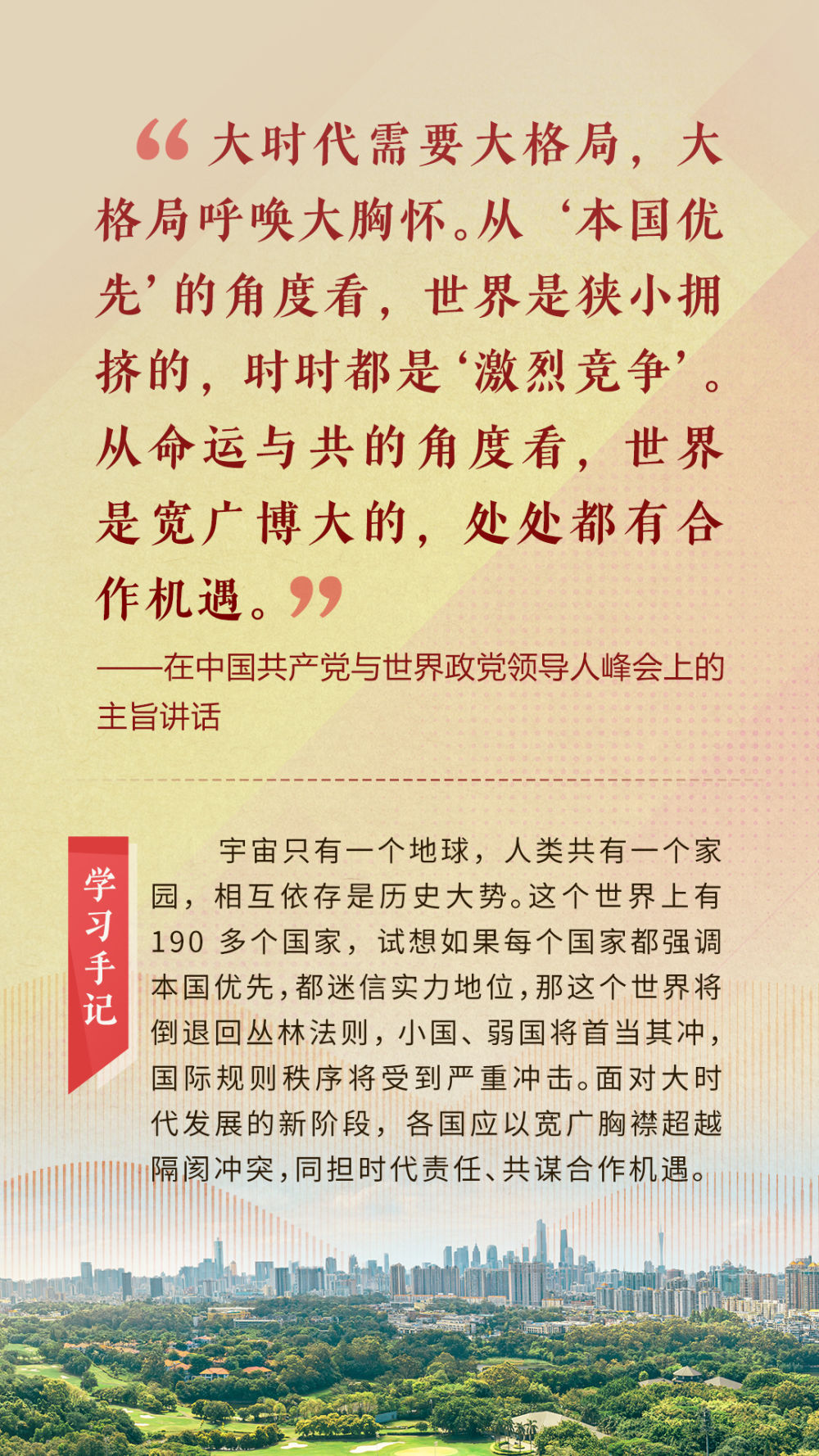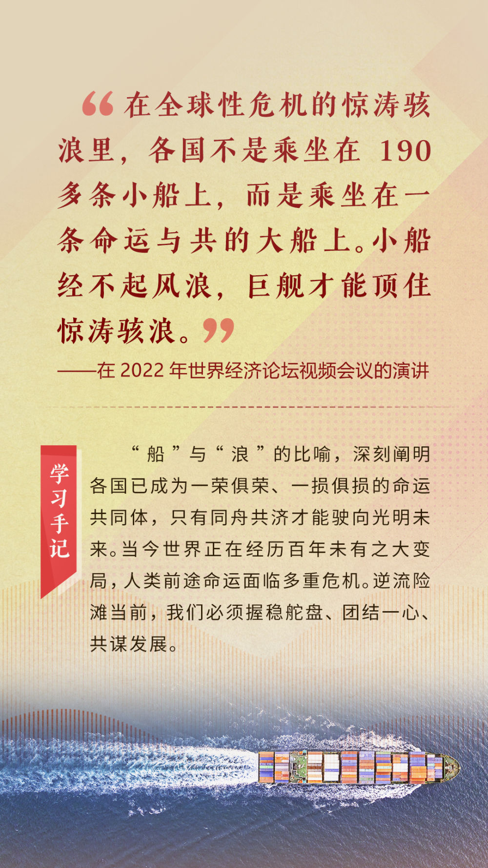 “天空足夠大,地球足夠大,世界也足夠大,容得下各國共同發(fā)展繁榮”“你中有我、我中有你的命運共同體”“與中國同行就是與機遇同行”……習(xí)近平總書記一次次在重要場合發(fā)表重要講話,指引我們站在歷史正確的一邊,站在人類進步的一邊,不畏浮云、登高望遠,不懼風(fēng)浪、勇毅前行。