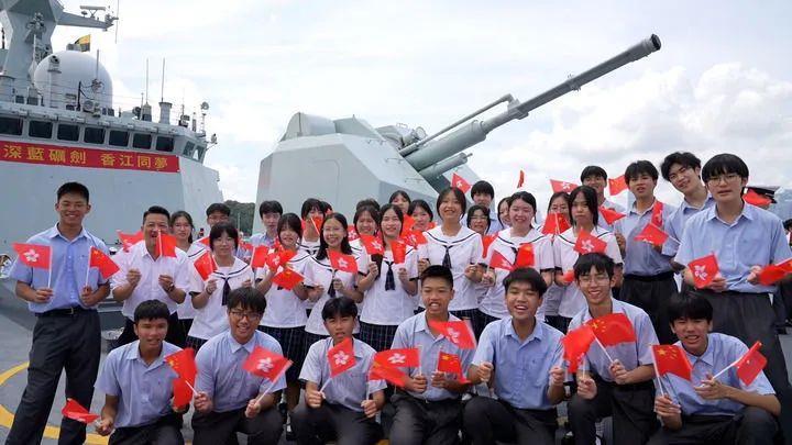 △2025年7月3日,中國海軍山東艦航母編隊(duì)抵達(dá)香港。香港中學(xué)生登上海軍運(yùn)城艦參觀、留影。