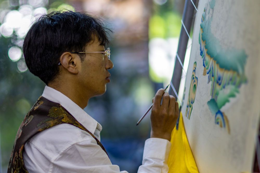 ↑ 8月6日,一名畫(huà)師在繪制唐卡。藏族唐卡(齊吾崗派)入選國(guó)家級(jí)非物質(zhì)文化遺產(chǎn)代表性項(xiàng)目名錄。