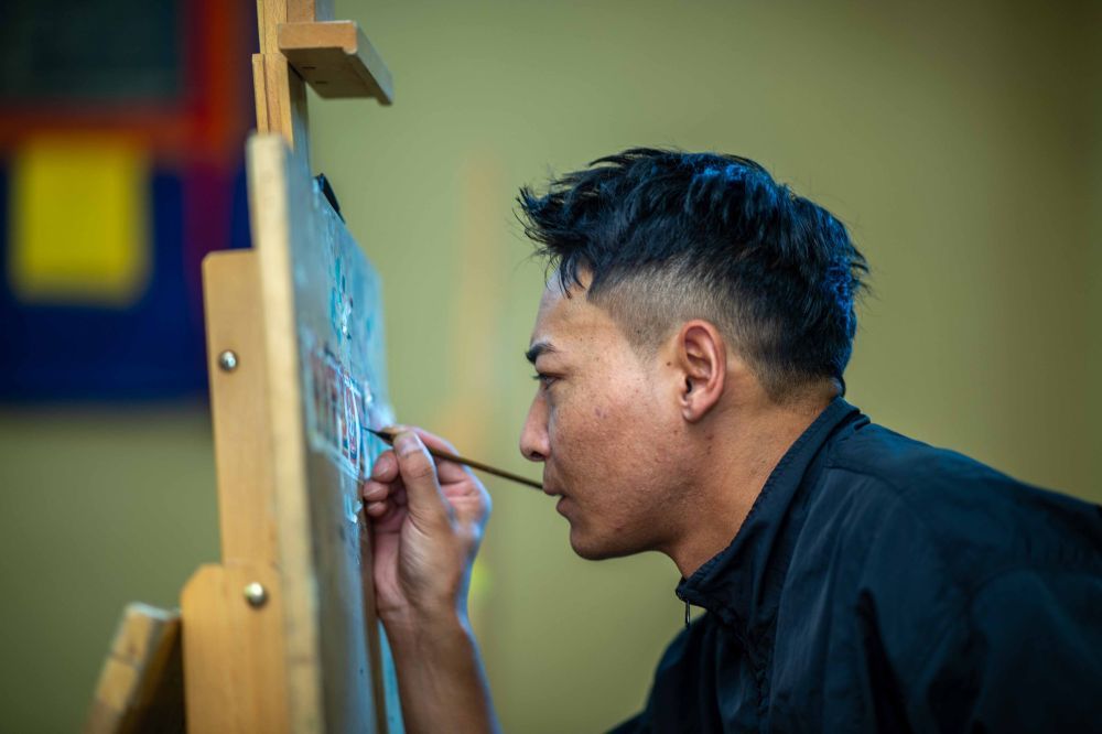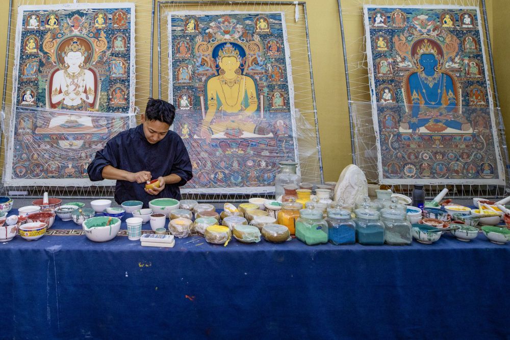 ↑ 8月6日,一名畫(huà)師在繪制唐卡。藏族唐卡入選國(guó)家級(jí)非物質(zhì)文化遺產(chǎn)代表性項(xiàng)目名錄。