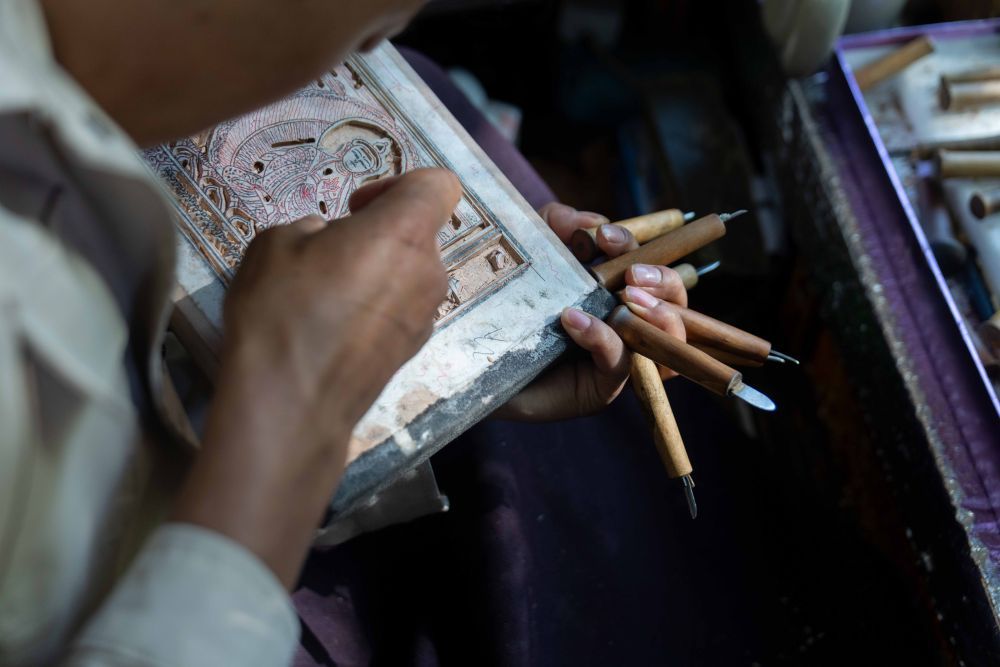 ↑ 8月6日,一名雕刻師在雕刻中。西藏雪巴康雕版印刷制作技藝入選西藏自治區(qū)級(jí)非物質(zhì)文化遺產(chǎn)代表性項(xiàng)目名錄。