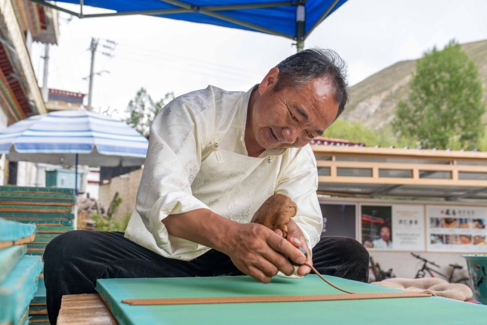 ↑ 8月6日,一名雕刻師在工作中。西藏傳統(tǒng)雕刻修復(fù)技藝入選西藏自治區(qū)級(jí)非物質(zhì)文化遺產(chǎn)代表性項(xiàng)目名錄。