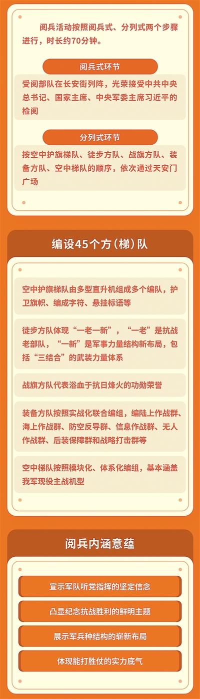 閱兵活動(dòng)按照閱兵式、分列式兩個(gè)步驟進(jìn)行,時(shí)長(zhǎng)約70分鐘。閱兵式環(huán)節(jié),受閱部隊(duì)在長(zhǎng)安街列陣,光榮接受中共中央總書(shū)記、國(guó)家主席、中央軍委主席習(xí)近平的檢閱。分列式環(huán)節(jié),按空中護(hù)旗梯隊(duì)、徒步方隊(duì)、戰(zhàn)旗方隊(duì)、裝備方隊(duì)、空中梯隊(duì)的順序,依次通過(guò)天安門(mén)廣場(chǎng)。