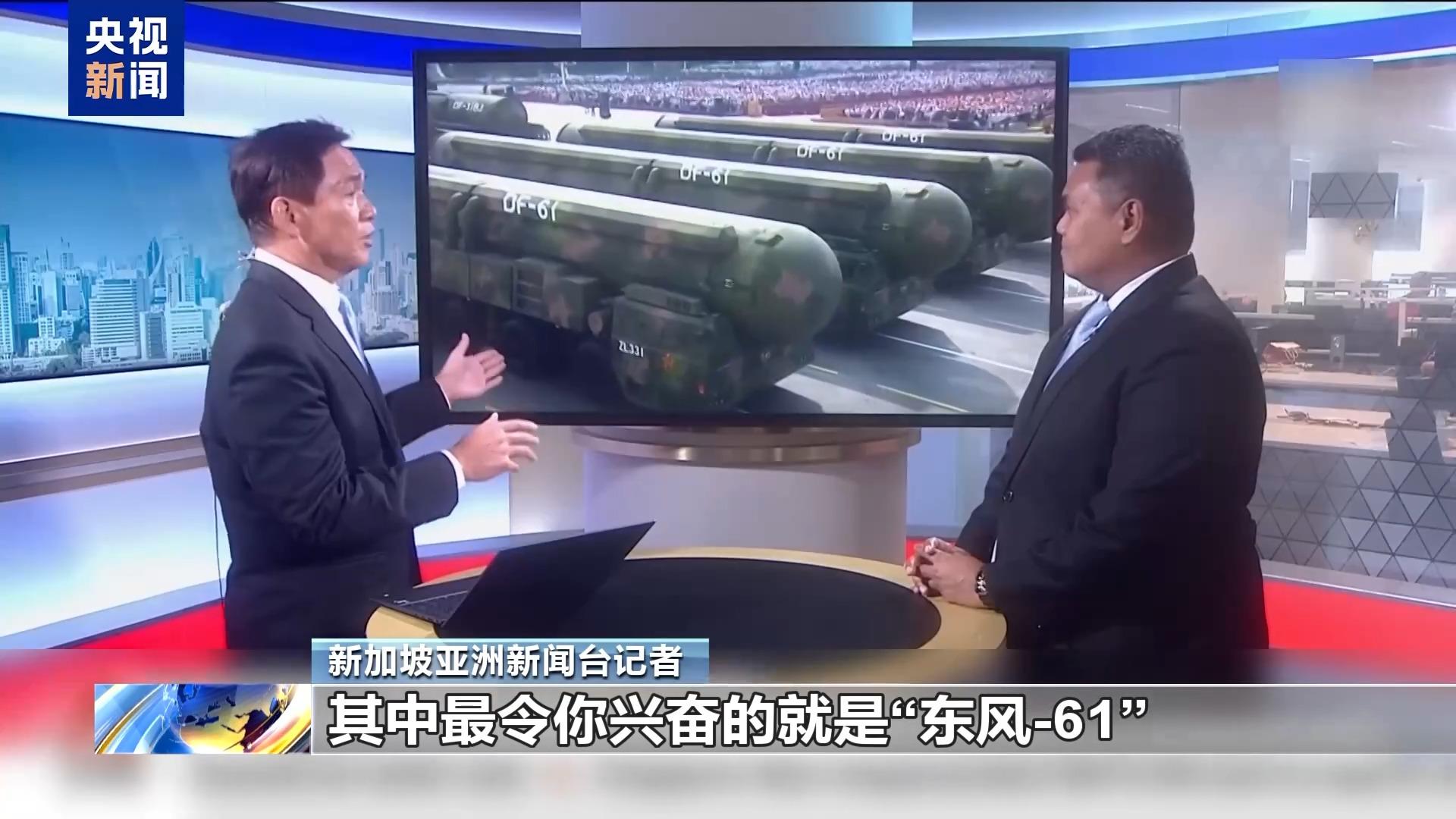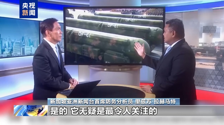 新加坡亞洲新聞臺首席防務(wù)分析員 里茲萬·拉赫馬特:是的,它無疑是最令人關(guān)注的,因為社交媒體上此前彩排的畫面中,它都沒有出現(xiàn)過。我預(yù)計它的射程要比"東風(fēng)-41"更長。
