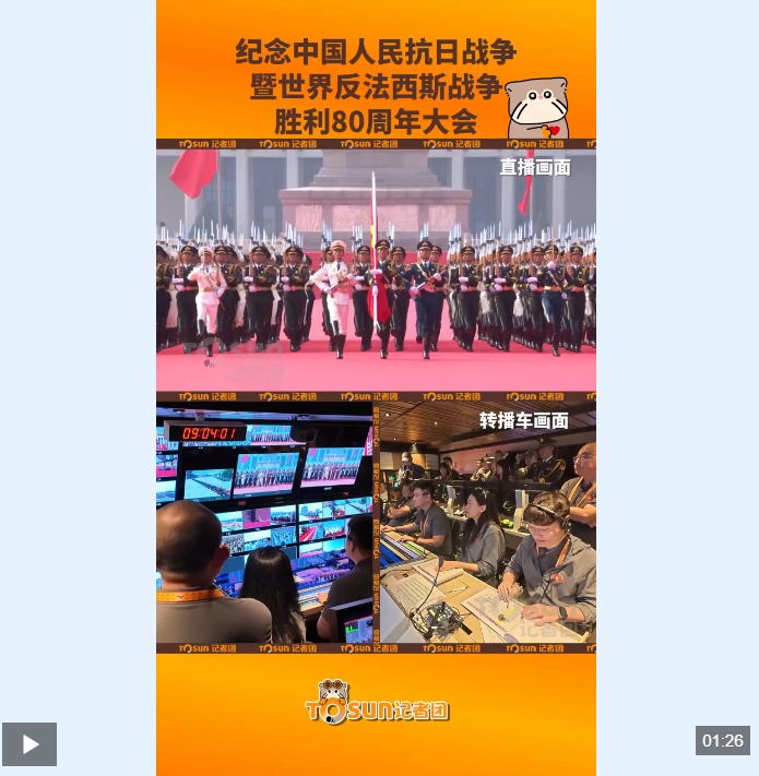 9月3日上午,紀(jì)念中國人民抗日戰(zhàn)爭暨世界反法西斯戰(zhàn)爭勝利80周年大會(huì)在北京天安門廣場隆重舉行,以盛大閱兵儀式,同世界人民一道紀(jì)念這個(gè)偉大的日子。 從人民英雄紀(jì)念碑,到五星紅旗升起的地方,從偉大勝利走向偉大復(fù)興。跟隨ToSun記者團(tuán)的鏡頭,看總臺(tái)直播團(tuán)隊(duì)如何切出閱兵式直播中讓人熱血澎湃的“中國排面”。 |