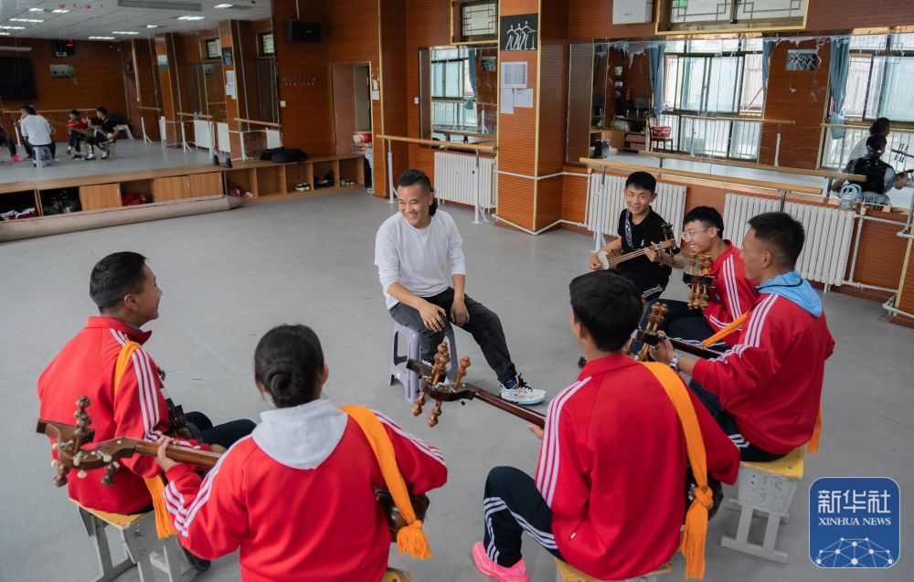 ↑ 9月9日,在拉薩市第二中等職業(yè)技術(shù)學(xué)校,洛桑次仁老師在給孩子們傳授扎念琴?gòu)椬嗟囊I(lǐng)。