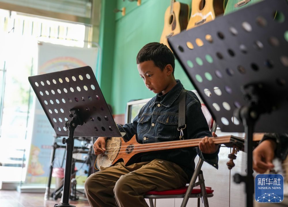 ↑ 9月13日,在拉薩市古樂(lè)扎念琴行,一名男孩在彈奏扎念琴。
