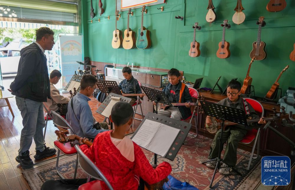 ↑ 9月13日,在拉薩市古樂(lè)扎念琴行,桑嘎西熱老師在指導(dǎo)孩子彈奏扎念琴。