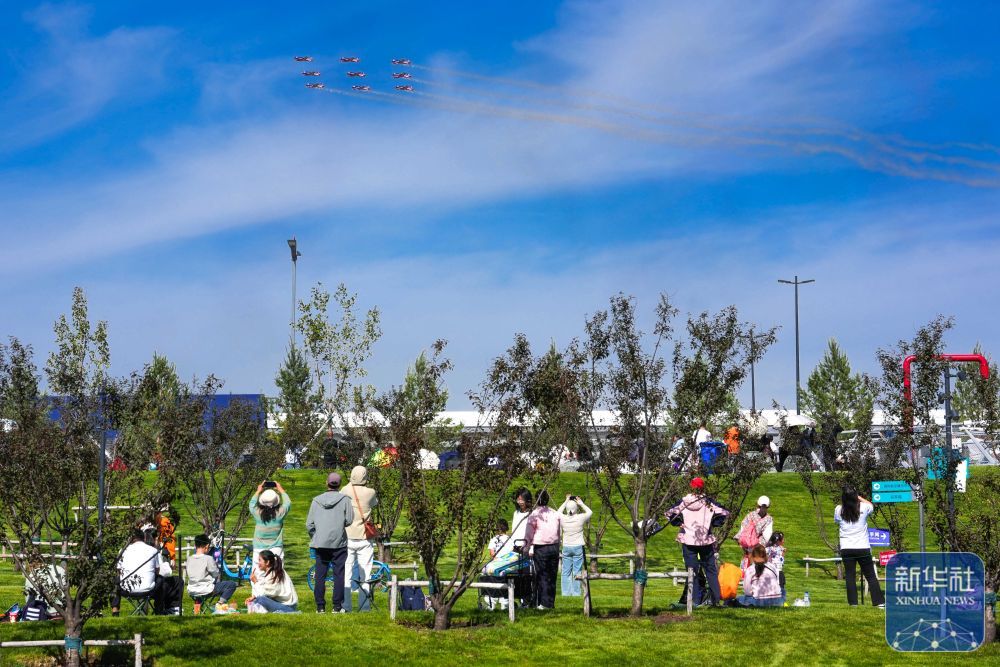 ↑ 9月20日,參觀者在長(zhǎng)春市藍(lán)天公園內(nèi)觀賞飛行表演。