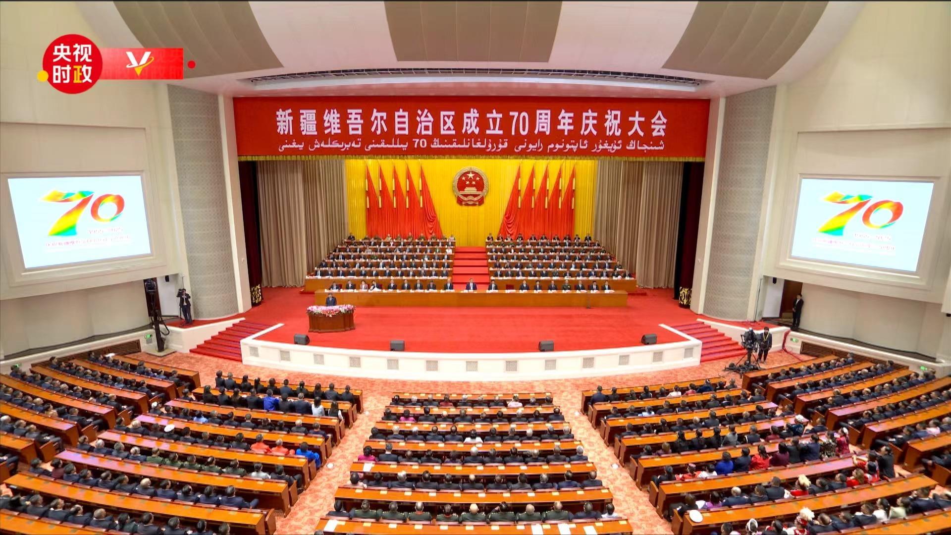 25日上午,新疆維吾爾自治區(qū)成立70周年慶祝大會(huì)在新疆人民會(huì)堂隆重舉行。中共中央總書記、國(guó)家主席、中央軍委主席習(xí)近平出席慶祝大會(huì)。