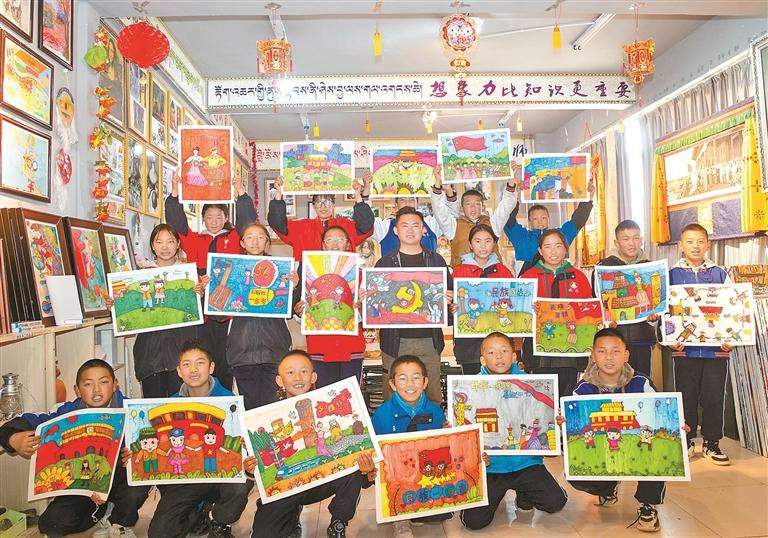山南市桑日縣中學(xué)美術(shù)興趣社團的學(xué)生展示自己的以"鑄牢中華民族共同體意識"為主題的繪畫作品。記者 洛桑 通訊員 次仁龍布 攝