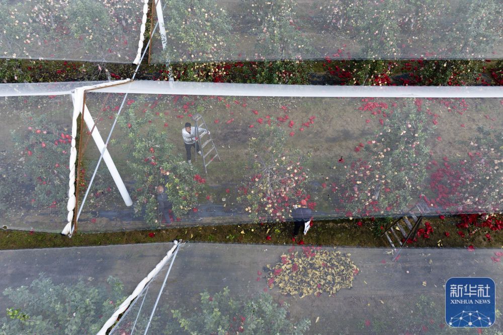 ↑ 10月17日,果農(nóng)在延安市寶塔區(qū)橋溝街道煙洞溝村蘋(píng)果園內(nèi)摘掉蘋(píng)果套袋(無(wú)人機(jī)照片)。新華社記者 邵瑞 攝