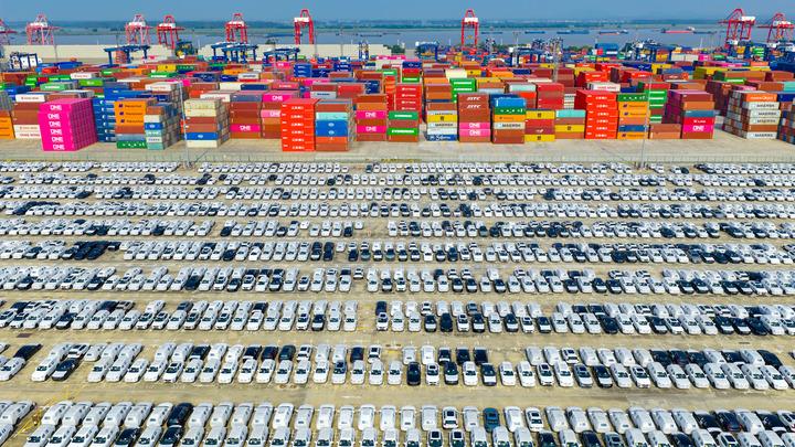 2025年10月4日在江蘇省港口集團南京港龍?zhí)陡蹍^(qū)拍攝的準備裝船出口的汽車(無人機照片)。新華社發(fā)(楊素平攝)