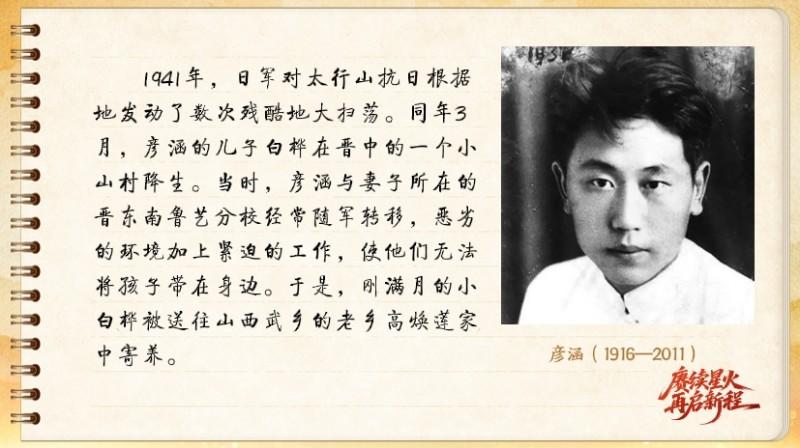 1941年,日軍對太行山抗日根據(jù)地發(fā)動了數(shù)次殘酷地大掃蕩。同年3月,彥涵的兒子白樺在晉中的一個小山村降生。當(dāng)時,彥涵與妻子所在的晉東南魯藝分校經(jīng)常隨軍轉(zhuǎn)移,惡劣的環(huán)境加上緊迫的工作,使他們無法將孩子帶在身邊。于是,剛滿月的小白樺被送往山西武鄉(xiāng)的老鄉(xiāng)高煥蓮家中寄養(yǎng)。