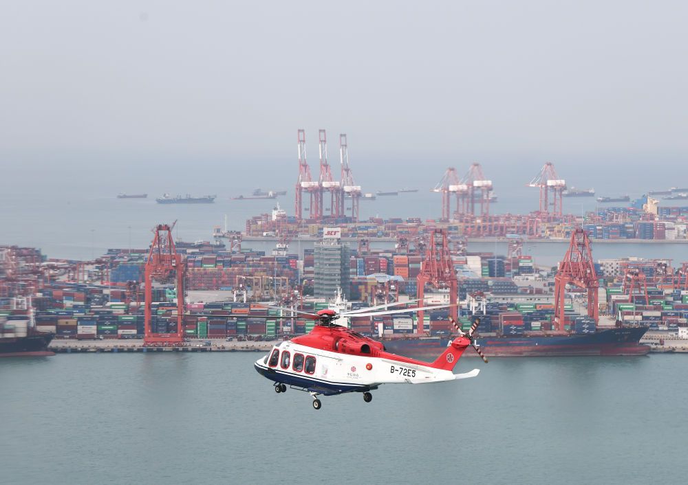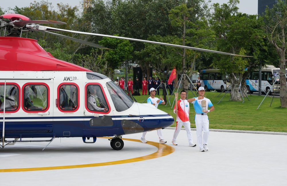 ↑ 搭載圣火的直升機(jī)進(jìn)行空中傳遞。新華社記者 江漢 攝