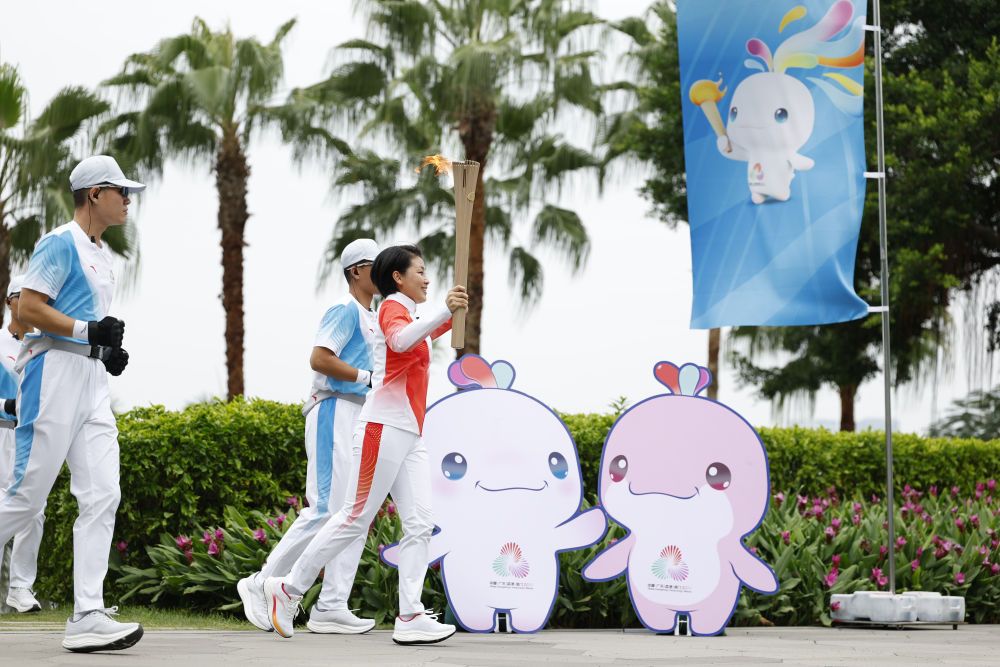 ↑ 火炬手李嘉宜(中)在廣州越秀公園內(nèi)的五羊雕像前傳遞火炬。新華社記者 杜宇 攝