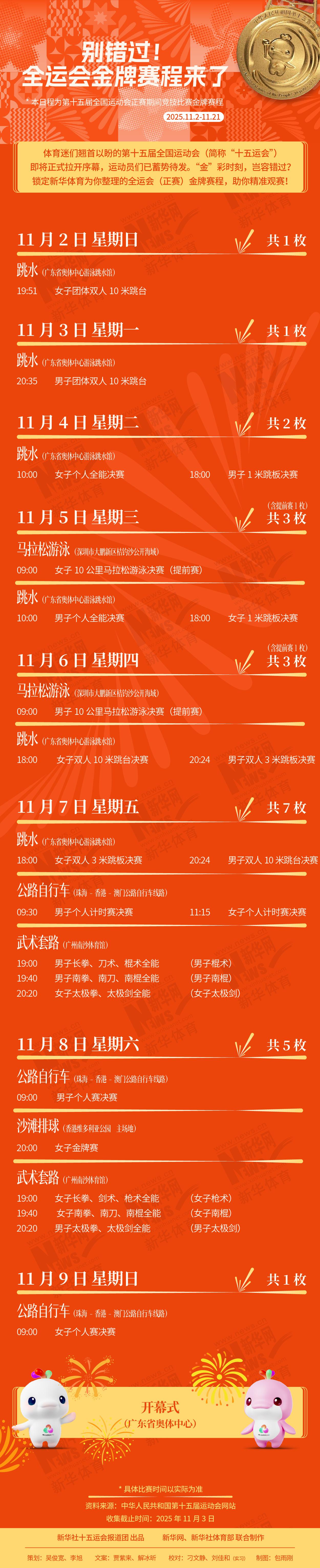 體育迷們翹首以盼的第十五屆全國運動會(簡稱“十五運會”)即將正式拉開序幕,運動員們已蓄勢待發(fā)?!敖稹辈蕰r刻,豈容錯過?鎖定新華體育為你整理的全運會(正賽)金牌賽程,助你精準(zhǔn)觀賽!
