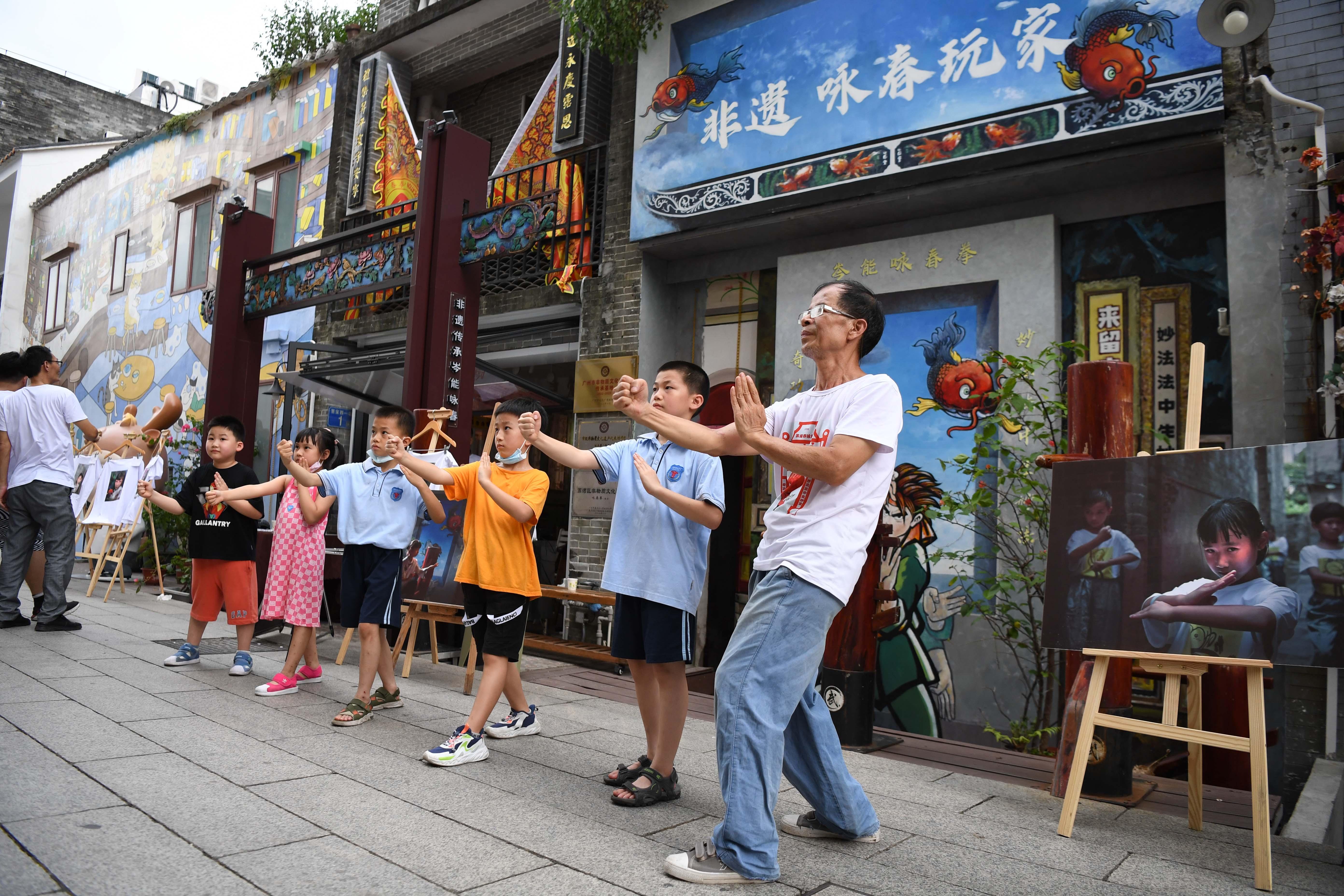 孩子們?cè)趶V州永慶坊體驗(yàn)詠春拳(2022年7月18日攝)。