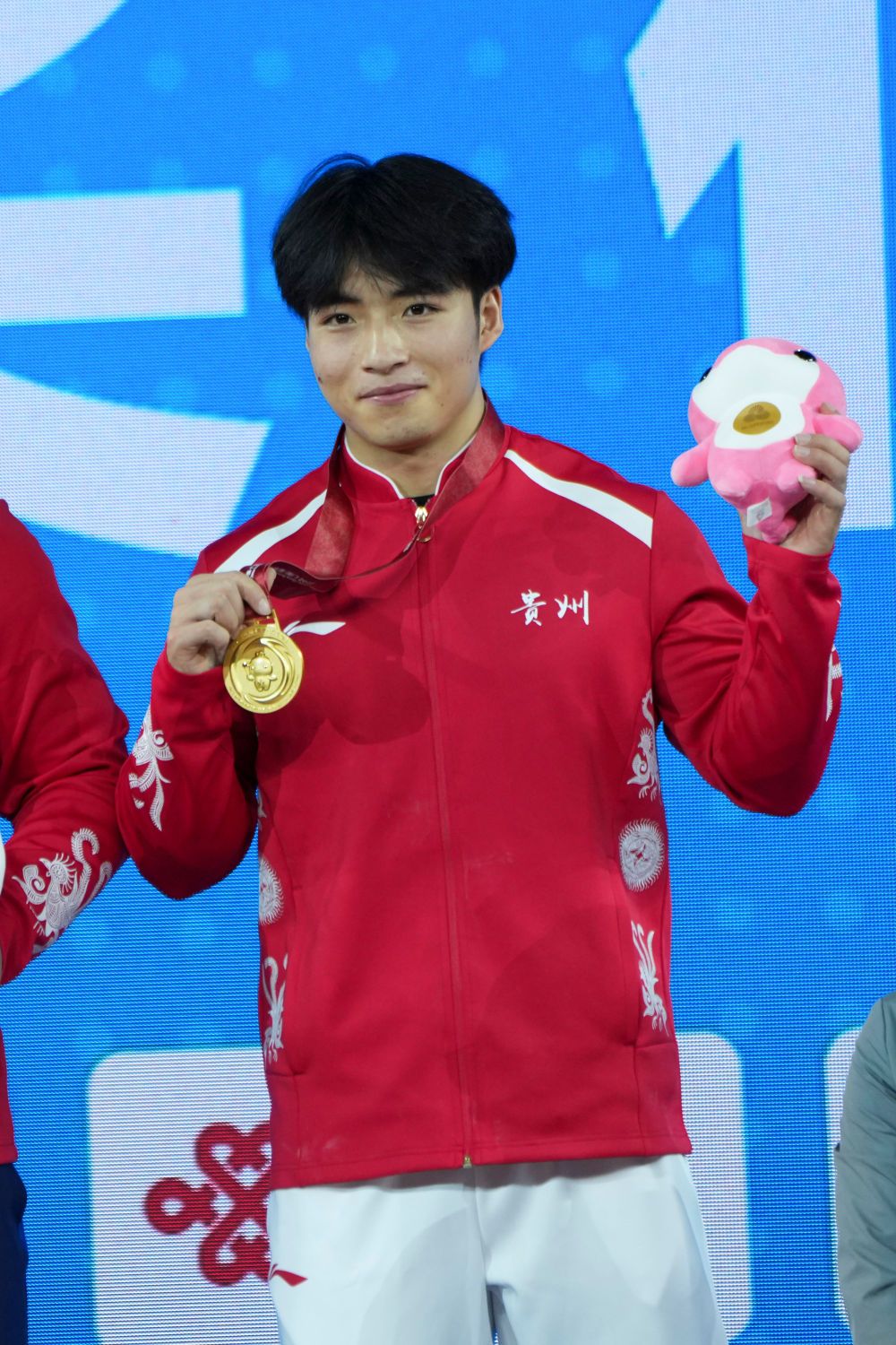 ↑11月18日,獲得冠軍的貴州隊(duì)選手雷江清在頒獎(jiǎng)儀式上展示金牌,他身上的貴州代表隊(duì)服裝上繡著傳統(tǒng)紋飾。新華社記者 楊晨光 攝