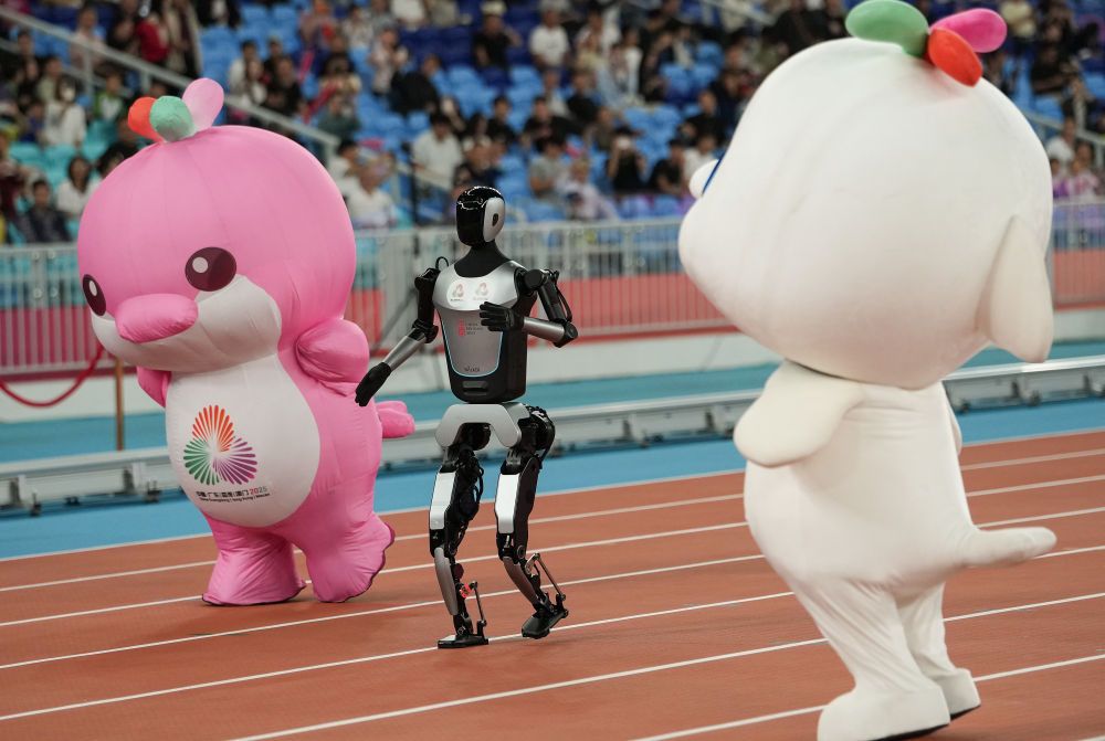 11月17日,在田徑項(xiàng)目賽事開(kāi)始前的暖場(chǎng)活動(dòng)中,機(jī)器人和吉祥物喜洋洋在廣東奧體中心體育場(chǎng)賽跑。