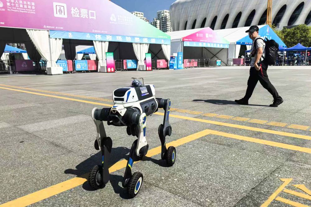 11月15日,機(jī)器狗在田徑項(xiàng)目女子標(biāo)槍及格賽中運(yùn)送標(biāo)槍。