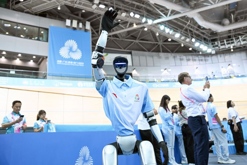 11月13日,參與場(chǎng)地自行車女子團(tuán)體競(jìng)速賽決賽賽前表演的機(jī)器人向現(xiàn)場(chǎng)觀眾招手互動(dòng)。