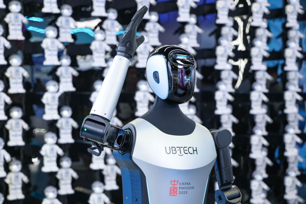 2025年4月23日,在深圳優(yōu)必選科技展廳內(nèi),商用版人形機(jī)器人Walker C向觀眾揮手致意。