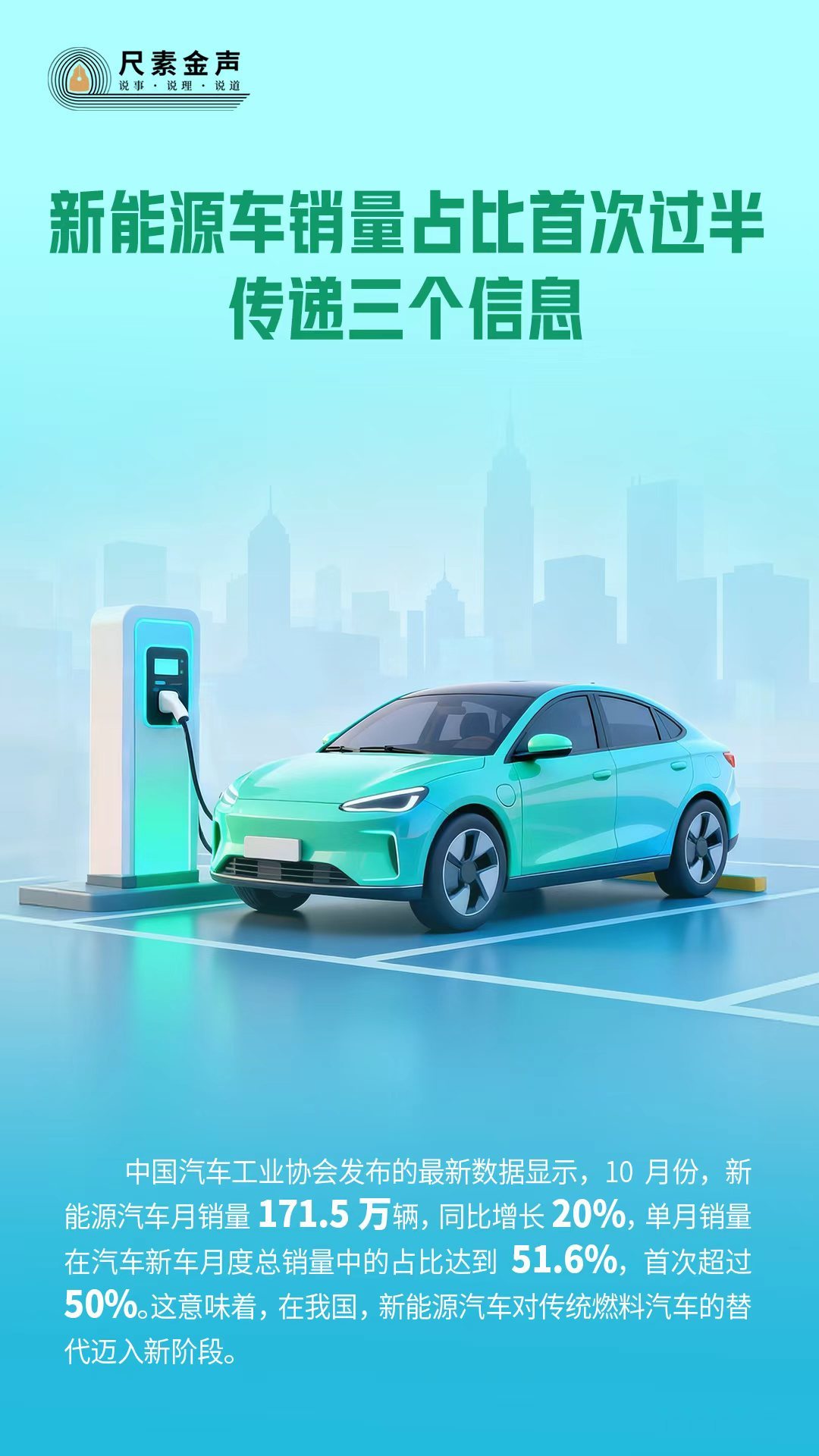 中國汽車工業(yè)協(xié)會發(fā)布的最新數(shù)據(jù)顯示,10月份,新能源汽車月銷量171.5萬輛,同比增長20%,單月銷量在汽車新車月度總銷量中的占比達到51.6%,首次超過50%。這意味著,在我國,新能源汽車對傳統(tǒng)燃料汽車的替代邁入新階段。